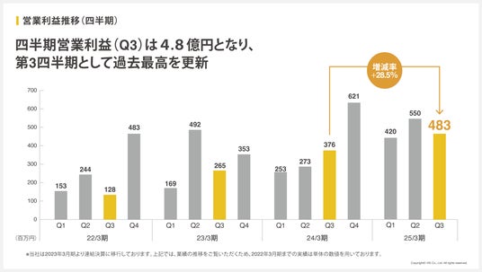 当四半期の営業利益は、483百万円となり、第3四半期として過去最高を更新しました。