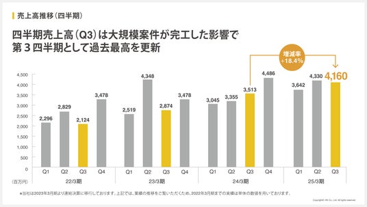 当四半期の売上高は大規模案件が完工した影響で第3四半期として過去最高を更新し、4,160百万円となりました。