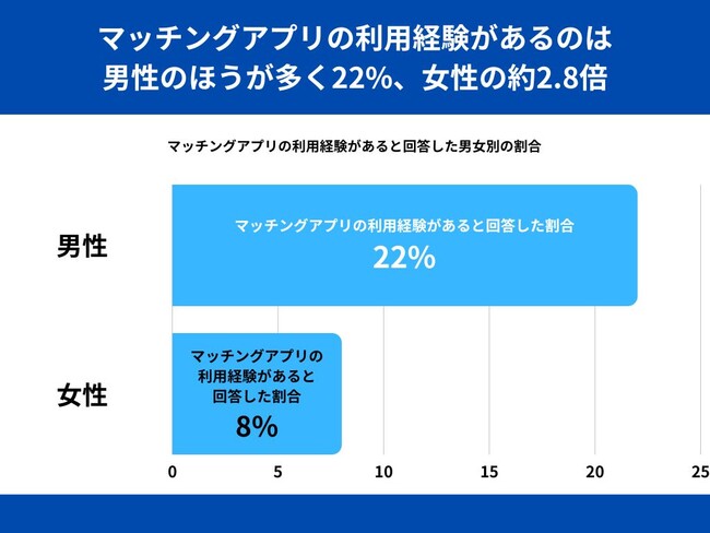 【マッチングアプリの利用経験があるのは男性のほうが多く22%、女性の約2.8倍】
