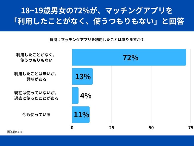 18~19歳の男女を対象とした「マッチングアプリを利用したことはありますか?」というアンケートで最も多かった回答は「利用したことがなく、使うつもりもない」で72%でした。