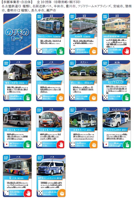 「のりものカード」は、参画する交通事業者および自治体共通のデザインに、各事業者が運行している電車・バス・飛行機などの特徴や情報を掲載するほか、じゃんけんやすごろく等でも遊べるカードです。これは、当地域における公共交通分担率向上を目的とした公共交通機関の認知拡大・利用促進のための取り組みで、コミュニティバスなどに対する若年層の認知度を上げたいという沿線自治体の思いから発案された企画です。