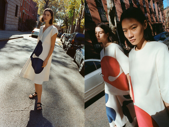 染料とキャンバスを用いてミニマルなフォルムをダイナミックに描き、抽象的なアート作品を制作することで知られるランドン・メッツ。今回のコラボレーションは「ウェアラブルなアート」がテーマに、メッツの洗練されたプリントデザインとマリメッコのシンプルかつボリューム感あふれるシルエットが融合し、シーズンテーマ「ネオ フューチャリズム(Neo Futurism)」が感じられるコレクションとなっています。