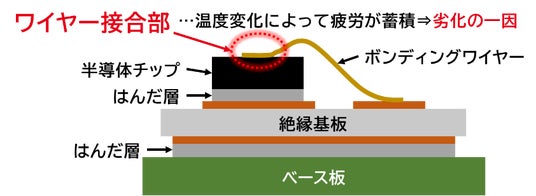 パワー半導体モジュールは、半導体チップとボンディングワイヤー(※5)の接合部(ワイヤー接合部)に、通電時の温度変化によって機械的な疲労が蓄積することが劣化の一因となるため、ワイヤー接合部近傍の半導体チップの温度変化を把握することが劣化状況の推定に繋がります。