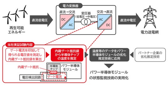 カーボンニュートラルの実現に向けて再生可能エネルギーの導入拡大が求められる中、電力変換を担うパワーエレクトロニクス機器の信頼性、保守性の向上が課題となっています。これに対し、パワーエレクトロニクス機器の基幹部品であるパワー半導体モジュールは、技術革新による信頼性の向上や、劣化状況の把握のための稼働状態のデータ取得・解析技術に加えて、その結果に基づく適切なタイミングでのメンテナンスによる保守性の向上が期待されています。