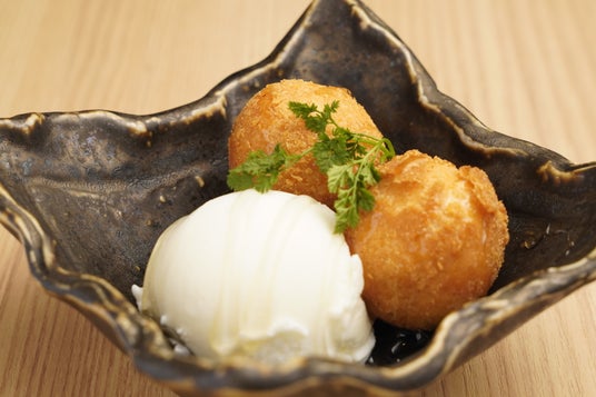 北海道ミルクアイスとチーズボールのハチミツがけ北海道ミルクアイスのやさしい甘みと、揚げたてチーズボールの塩味。仕上げにかけるハチミツが全体をまとめます。