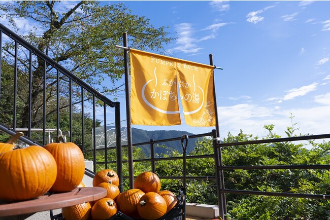 水着で遊べる温泉ユネッサンの屋外エリアで、眺望が自慢の「超絶景 露天風呂」に、北海道より取り寄せた直径30cmほどの巨大かぼちゃを湯に浮かべます。秋晴れの日は、澄み切った箱根の空気の中、箱根外輪山を眺めながら、オレンジ色に輝くかぼちゃと一緒に温泉をお楽しみいただけます。