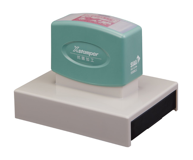「角型印65100号 抗菌」は、駅や空港、テーマパーク、観光名所など、場所に合わせて印面をデザインできるインキ内蔵式のスタンパーです。今回、グリップ部分を抗菌加工した仕様で新たに発売します。