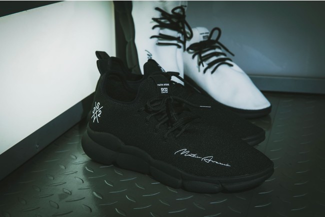 底のソール部分はイタリアソールメーカーVibram社のソールを使用。アッパーの素材はストレスフリーのニット素材を使用している。両外側のつま先にMATINAVENIRの刺繍、左右外側のかかとにSY32の刺繍が入っている。¥31,900 (税込) BLACK/WHITE