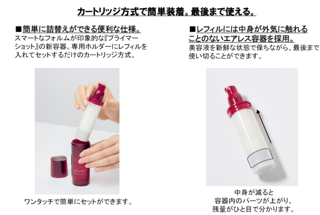 今回の『プライマーショット』のレフィル仕様も、ご愛用いただいているお客様の熱いご要望から誕生。容器のプラスチック量を37%削減*できる上、最後までしっかり使い切れます。
