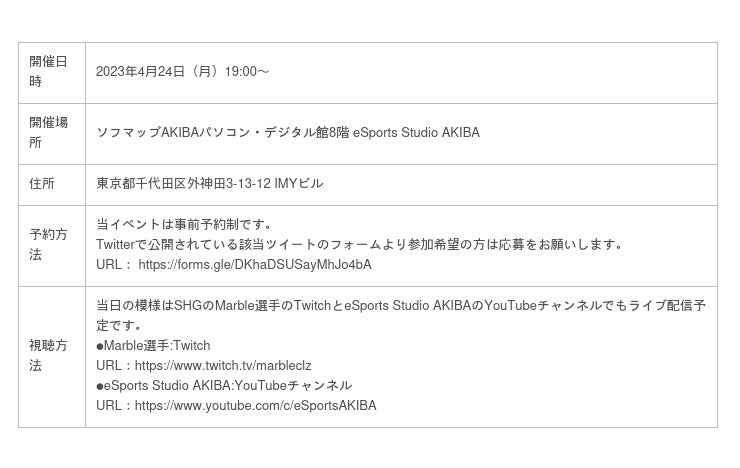 予約制となっておりますので、Twitterで公開されている該当ツイートのフォームより参加希望の方は応募をお願いいたします。当日の模様はSHGのMarble選手のTwitch(https://www.twitch.tv/marbleclz)でもライブ配信予定です。