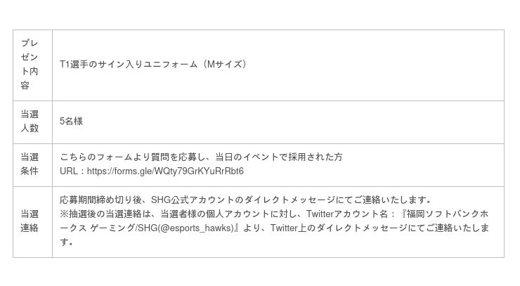 当イベント中にT1選手に読み上げられた質問をお送りしてくれた方には、プレゼントとしてT1選手のサイン入りユニフォームをプレゼントします!こちらも当該ツイートより応募可能ですので、ふるってご応募ください。