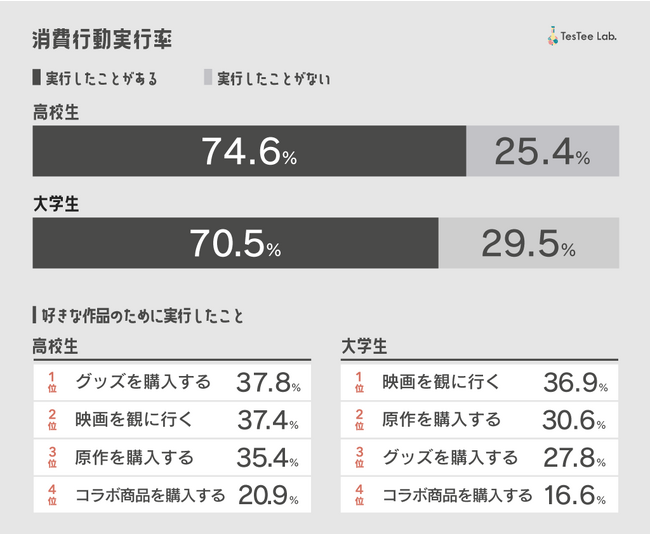 そして、消費行動を実行したことがあると回答した人を対象に実行したことを尋ねたところ、高校生の第1位は「グッズを購入する」、大学生の第1位は「映画を観に行く」という結果になり、高校生と大学生では実行することに違いが見られました。
