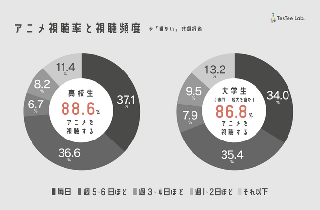 メディア事業・リサーチ事業・プロモーション事業を展開する株式会社テスティー(本社:東京都渋谷区、代表取締役:横江優希)は、若年層リサーチ結果を発信する「TesTee Lab」にて、高校生・大学生(短大・専門含む)の男女1,289名(高校生男性215名、高校生女性356名、大学生男性349名、大学生女性369名)を対象に「アニメ」に関する調査を実施しました。