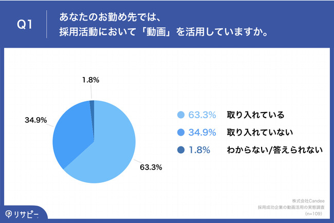 「Q1.あなたのお勤め先では、採用活動において「動画」を活用していますか。」(n=109)と質問したところ、「取り入れている」が63.3%、「取り入れていない」が34.9%という回答となりました。