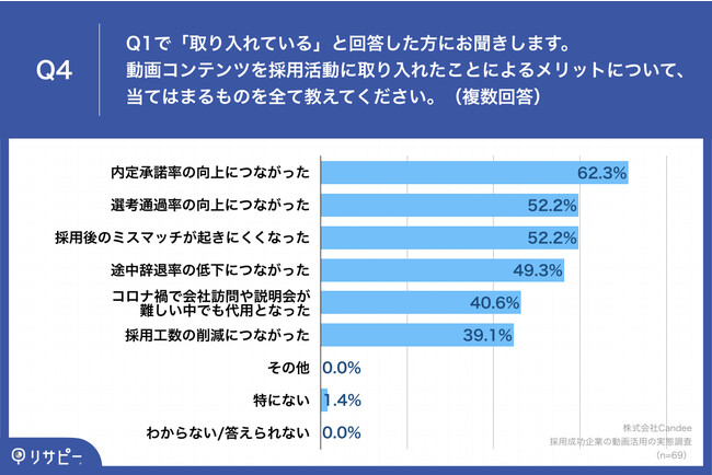 Q1で「取り入れている」と回答した方に、「Q4.動画コンテンツを採用活動に取り入れたことによるメリットについて、当てはまるものを全て教えてください。(複数回答)」(n=69)と質問したところ、「内定承諾率の向上につながった」が62.3%、「選考通過率の向上につながった」が52.2%、「採用後のミスマッチが起きにくくなった」が52.2%という回答となりました。