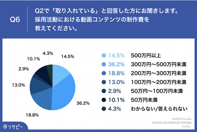 Q1で「取り入れている」と回答した方に、「Q6.採用活動における動画コンテンツの制作費を教えてください。」(n=69)と質問したところ、「300万円~500万円未満」が36.2%、「200万円~300万円未満」が18.8%という回答となりました。