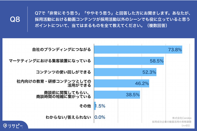 Q7で「非常にそう思う」「ややそう思う」と回答した方に、「Q8.あなたが、採用活動における動画コンテンツが採用活動以外のシーンでも役に立っていると思うポイントについて、当てはまるものを全て教えてください。(複数回答)」(n=65)と質問したところ、「自社のブランディングにつながる」が73.8%、「マーケティングにおける集客装置になっている」が58.5%、「コンテンツの使い回しができる」が52.3%という回答となりました。