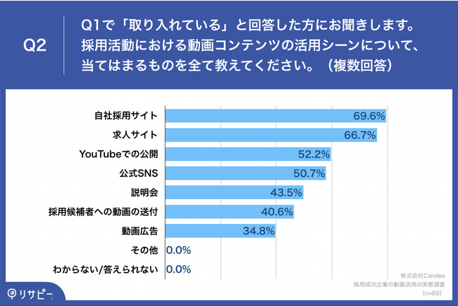 Q1で「取り入れている」と回答した方に、「Q2.採用活動における動画コンテンツの活用シーンについて、当てはまるものを全て教えてください。(複数回答)」(n=69)と質問したところ、「自社採用サイト」が69.6%、「求人サイト」が66.7%、「YouTubeでの公開」が52.2%という回答となりました。