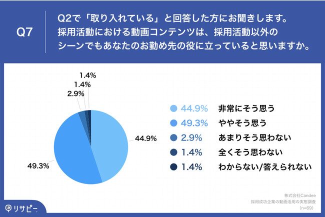 Q2で「取り入れている」と回答した方に、「Q7.採用活動における動画コンテンツは、採用活動以外のシーンでもあなたのお勤め先の役に立っていると思いますか。」(n=69)と質問したところ、「非常にそう思う」が44.9%、「ややそう思う」が49.3%という回答となりました。
