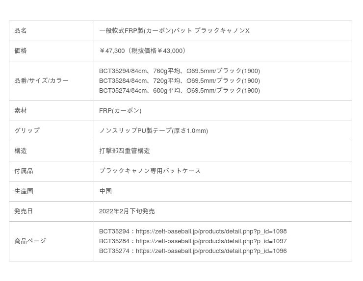 「ベースボールを科学する。」ゼット株式会社(本社/大阪市天王寺区、代表取締役社長/渡辺裕之)は、打撃部四重管構造+本体新形状により強烈な高速打球を生む一般軟式FRP製(カーボン)バット【ブラックキャノンX】を発売しました。