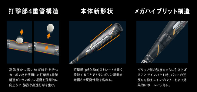 グリップ側の強度をさらに引き上げることでインパクト時、バットの逆反りを抑えスイングパワーを効果的にボールに伝えます。