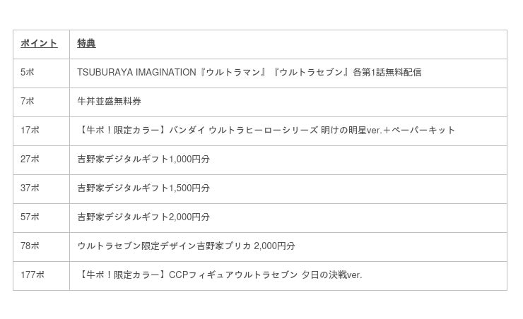 『牛ポ!』は吉野家公式アプリをダウンロードして参加するポイントキャンペーンです。全国の本キャンペーン実施店舗にてお会計をする際、公式アプリ内の専用バーコードをレジにて提示すると、税込500円ごとにつき「1ポ!」がアプリ上に会計日含めて4日以内に付与され、累計ポイントに応じた特典をもらえます。特典は吉野家店舗で会計時にお得になるデジタルクーポンやデジタルギフトをはじめ、ここでしか手に入らない【牛ポ!限定カラー】フィギュアウルトラセブン(夕日の決戦ver.)など『牛ポ!ウルトラ大作戦』限定の吉野家とウルトラセブンのオリジナルグッズを用意しました。