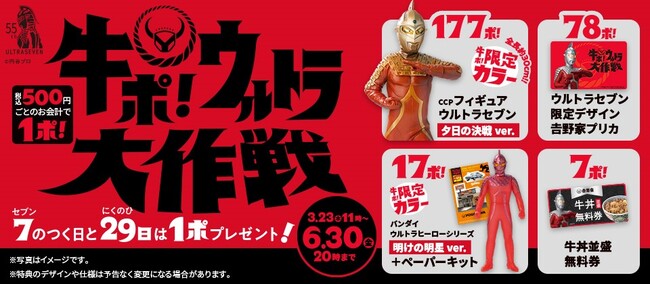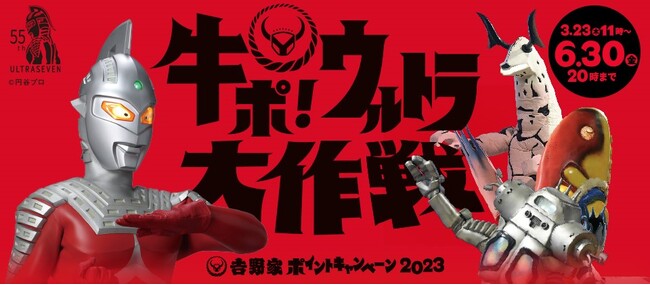 吉野家は、『ウルトラセブン』放送開始55周年を記念し、「ウルトラセブン」をイメージキャラクターに起用したポイントキャンペーン『牛ポ!ウルトラ大作戦』を実施いたします。