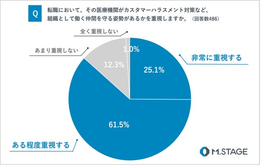 転職先を検討する際、医療機関が「働く仲間を守る姿勢」をどの程度重視するかについては、「非常に重視する」が25.1%、「ある程度重視する」が61.5%となりました。約9割の医師が、勤務先の組織的な対応姿勢を重視する結果となっています。
