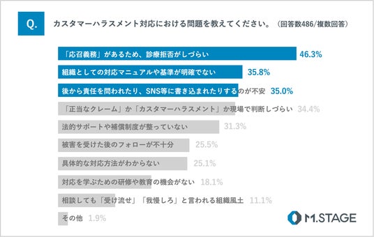 カスタマーハラスメント対応における問題については、「『応召義務』があるため、診療拒否がしづらい」と回答した医師が46.3%と最多の結果となりました。約半数の医師が、応召義務との兼ね合いから、毅然とした対応に踏み切りにくい状況にあることが分かりました。