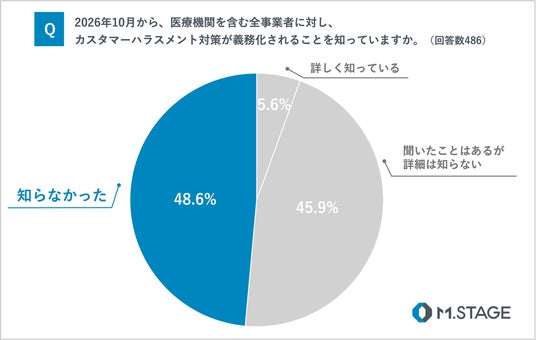 カスタマーハラスメント対策の義務化について、「知らなかった」と回答した医師は約半数に上り、医療現場において、制度面での周知が進んでいない状況が明らかになりました。また、勤務先での対策状況については、約7割の医師が「あまり十分ではない」「全く不十分である」と回答する結果となりました。