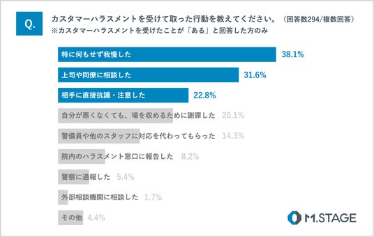 カスタマーハラスメントを受けて取った行動としては、「特に何もせず我慢した」と回答した医師が38.1%となりました。これは、被害に遭った医師のおよそ2.5人に1人が、何らかの対処を諦め、抱え込んでいる実態を示しています。