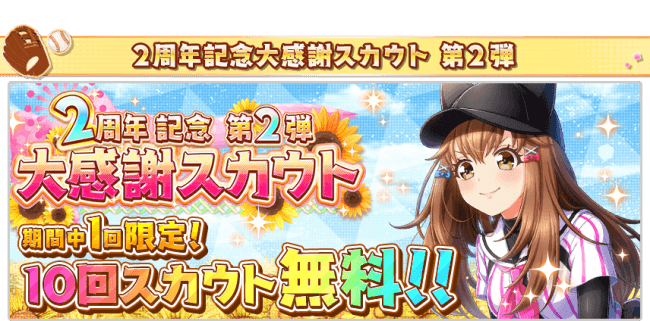 リリース2周年を記念し、ゲーム内ではキャンペーンを開催中です。キャンペーンは第3弾まで開催予定となっており、各期間1回ずつ無料10連ガチャ(スカウト)に挑戦できます。第2弾は7月16日までとなっておりますので、お見逃しなく!