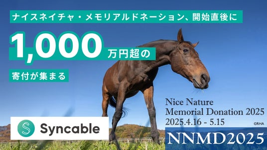 寄付プラットフォーム「Syncable(シンカブル)」を運営する株式会社STYZ(本社:東京都渋谷区、代表取締役:田中辰哉)は、認定NPO法人 引退馬協会が実施する「ナイスネイチャ・メモリアルドネーション2025」において、キャンペーン開始当日に1,000万円を超える寄付が集まったことをお知らせいたします。(4月22日(火)午前9時現在の支援総額は30,285,976円)