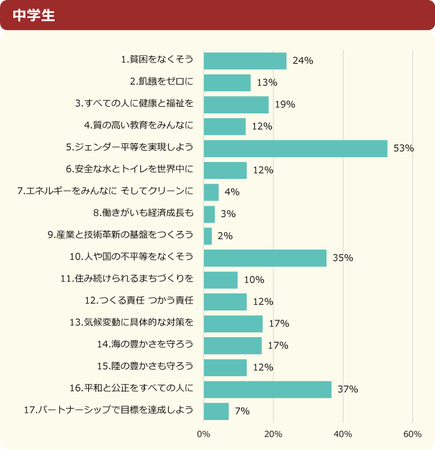 最も多かったのは、全体の44%を占めた「ジェンダー平等を実現しよう」でした。次いで「人や国の不平等をなくそう」が34%、「平和と公正をすべての人に」が33%でした。