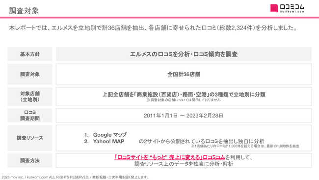 レポートをくわしく見る(無料)→ https://academy.kutikomi.com/whitepapers/202303_hermes/?utm_source=pressrelease&utm_medium=prtimes&utm_campaign=202303_hermes■ 本レポートの調査対象