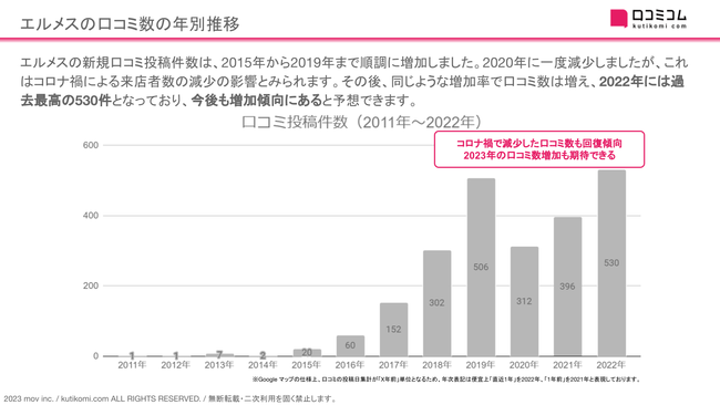 本レポートでは、エルメスを立地別で計36店舗を抽出、各店舗に寄せられた口コミ(総数2,324件)を分析しました。レポートをくわしく見る(無料)→ https://academy.kutikomi.com/whitepapers/202303_hermes/?utm_source=pressrelease&utm_medium=prtimes&utm_campaign=202303_hermes■ エルメスの口コミ数の年別推移