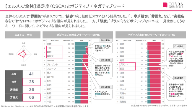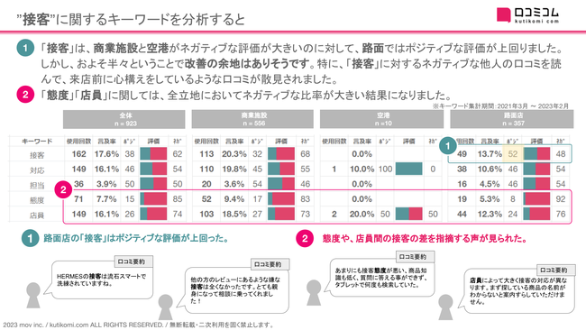 全体のQSCAは”雰囲気”が高スコアで、”接客”が比較的低スコアという結果でした。「丁寧」「親切」「雰囲気」など、”高級店ならでは”な口コミにはポジティブな傾向が見られました。一方、「態度」「ブランド」などポジティブな口コミと一見比例しそうなキーワードに関して、ネガティブな傾向が見られました。レポートでは、立地別の傾向についても同様に分析しています。レポートをくわしく見る(無料)→ https://academy.kutikomi.com/whitepapers/202303_hermes/?utm_source=pressrelease&utm_medium=prtimes&utm_campaign=202303_hermes