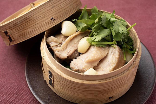 長州黒かしわのモモ肉をニンニクと一緒にセイロ蒸しにしました。寒い冬にピッタリの一品です。