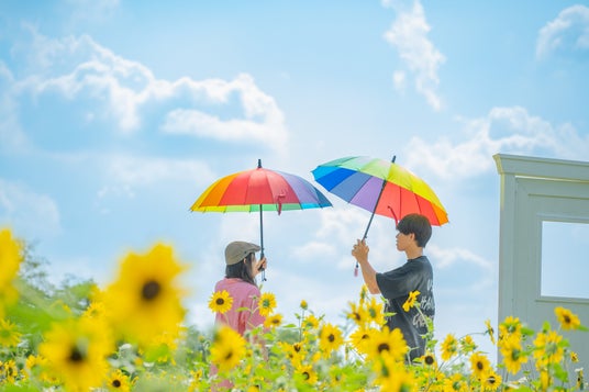定番の花畑だけでなく、園内各所に多彩なフォトスポットをご用意しました。中でもかたらいのイチョウ並木の「イチョウリフレクション」は夏シーズン初登場。紅葉時期とは違った風景をお楽しみいただけます。レインボーアンブレラを持って、お気に入りのフォトスポットを探してみてはいかがでしょうか?