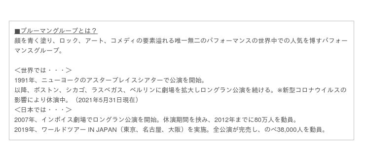 ■主催:ブルーマングループ ワールドツアー製作委員会(アミューズ/読売新聞社/トリックスターエンターテインメント/ぴあ/イープラス/クリエイティブマンプロダクション/ライブエグザム/ローソンチケット)