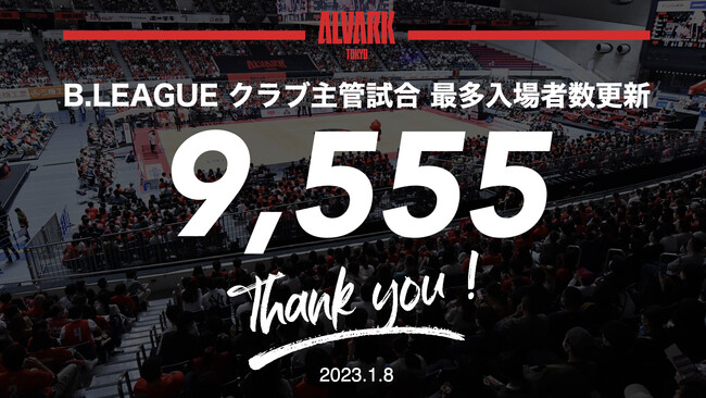 アルバルク東京は、2023年1月8日(日)に国立代々木競技場第一体育館にて行ったB.LEAGUE2022-23シーズン 第16節川崎ブレイブサンダース戦にて、入場者数が9,555名となりました。