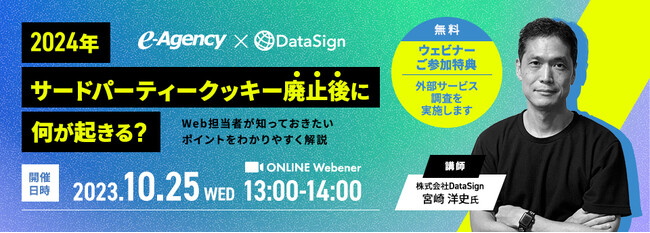 “おもてなしを科学する”株式会社イー・エージェンシー(本社:東京都千代田区、代表取締役:甲斐真樹)は、「2024年度のデータプライバシー対策」をテーマに、DataSign社 × イー・エージェンシー 共催ウェビナー「2024年 サードパーティークッキー廃止後に何が起きる? Web担当者が知っておきたいポイントをわかりやすく解説」を、10月25日(水)に開催いたします。