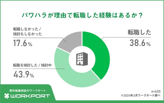 続いて、パワハラを受けたと回答した人全員に、パワハラが理由で転職した経験はあるか聞いたところ、「転職した」(38.6%)、「転職を検討した/検討中」(43.9%)が合わせて82.5%でした。前出の回答では「パワハラが解決した」とする人は12.1%に留まりましたが、勤務先での解決は諦め、転職により解決を図ろうと考える人が多いのかもしれません。