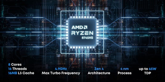 「AuBox 8745HS」の心臓部となるAMD Ryzen(TM) 7 8745HSは、8コア16スレッド、最大4.9GHzのブーストクロックを誇り、4nmプロセス・Zen 4アーキテクチャを採用。TDPは65Wで、高速レスポンスによるスムーズなマルチタスク処理、ゲーム、コンテンツ制作が可能です。