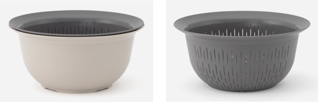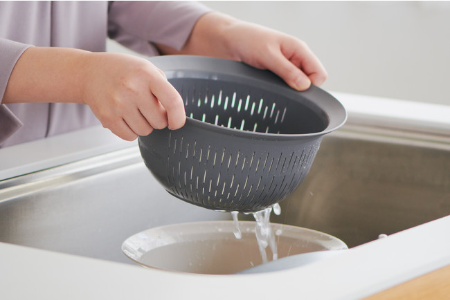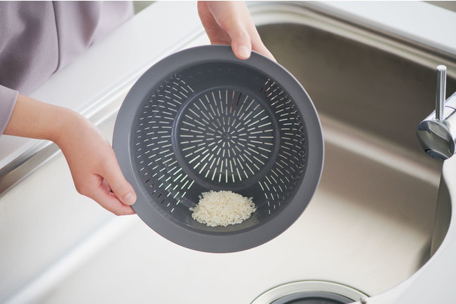 今回はほとんどのご家庭にある“ザル・ボウル”に着目し、料理のシーンがより快適になる商品を目標にして、開発しました。開発当初は米研ぎに特化した商品を目指し、楽に米研ぎができる形状の商品を試行錯誤したところ、その過程で、360度の大きなフチを付けてしっかり手で支えやすくすることで、混ぜる・こねる・水を切るなど、米研ぎ以外の調理も格段に楽になることに気付きました。調理のしやすさを持ちやすさでサポートし、時短にも繋がる今までにありそうでなかったザル・ボウルが完成しました。もちろん米研ぎの際の目詰まりのしにくさや、水切れの快適さにもこだわって開発をしています。