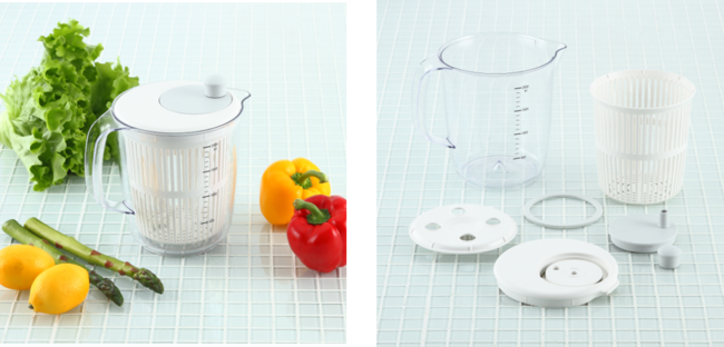 一般的なサラダスピナーに比べて縦長でスリムな形状でかさばらず、小さなスペースに収納することができます。細かいパーツまで分解可能なので、洗いやすく清潔に使用できる点もポイント。底に滑り止めのシリコーンゴム付きで滑りにくい設計にしました。