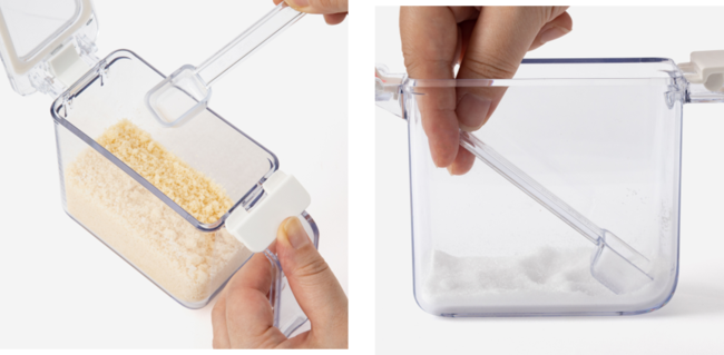 フタが透明で中身がわかりやすく、プッシュボタンでぱっと開くクッキングポットです。閉める際もプッシュボタンでカチッとロックでき、開け閉めしやすくなっています。フタはパッキンが一体になった構造でパーツも少なく洗いやすいため清潔に使えます。計量スプーンと本体のカーブがしっかりフィットするように合わせてあり、砂糖や塩が最後まですくいやすい形状にこだわりました。