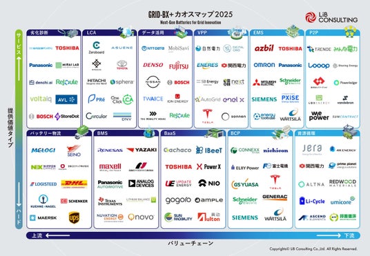 モビリティ・エネルギー業界に対するコンサルティング支援に強みを持つ株式会社リブ・コンサルティング(本社:東京都中央区、代表取締役:関厳、以下「当社」)は、新たなオファリングテーマ「GRID-BX+」を体系的に整理したカオスマップを公開。100以上の企業と、20以上の事業モデル事例を掲載したレポートを発信。さらに、本テーマの「GRID-BX+フォーラム2025 ~次世代バッテリーを活用した分散型エネルギー最適化の未来~」を9月に開催することをお知らせします。
