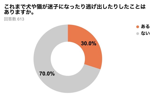 1.犬猫へのマイクロチップの装着登録は、迷子になった際の返還にも役立つとされています。これまで犬や猫が迷子になったり逃げ出したりしたことがあるか尋ねると、約3割が「ある」と回答しました。