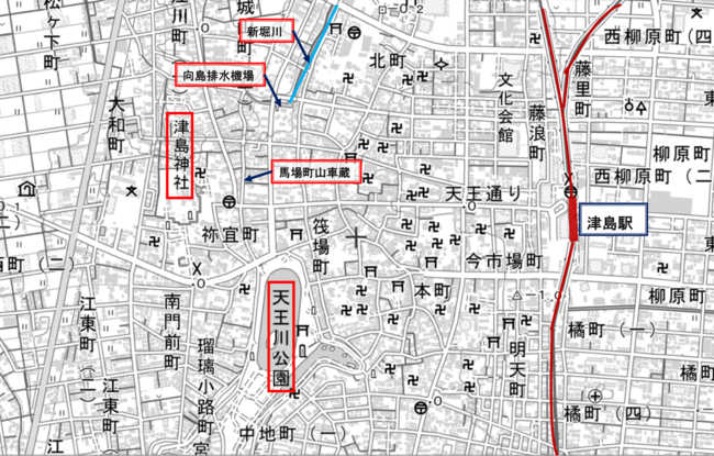 9 主なポイント:天王川公園、津島神社、馬場町山車蔵、向島排水機場、新堀川